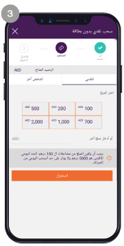 يمكنك البدء بالسحب النقدي بدون استخدام البطاقة على هاتفك المتحرك من خلال الدخول إلى تطبيق الخدمات المصرفية عبر الهاتف المتحرك من الإمارات الإسلامي واتباع الخطوات الثلاثة التالية: